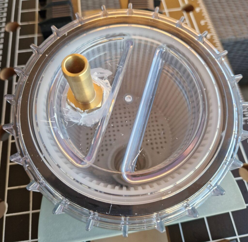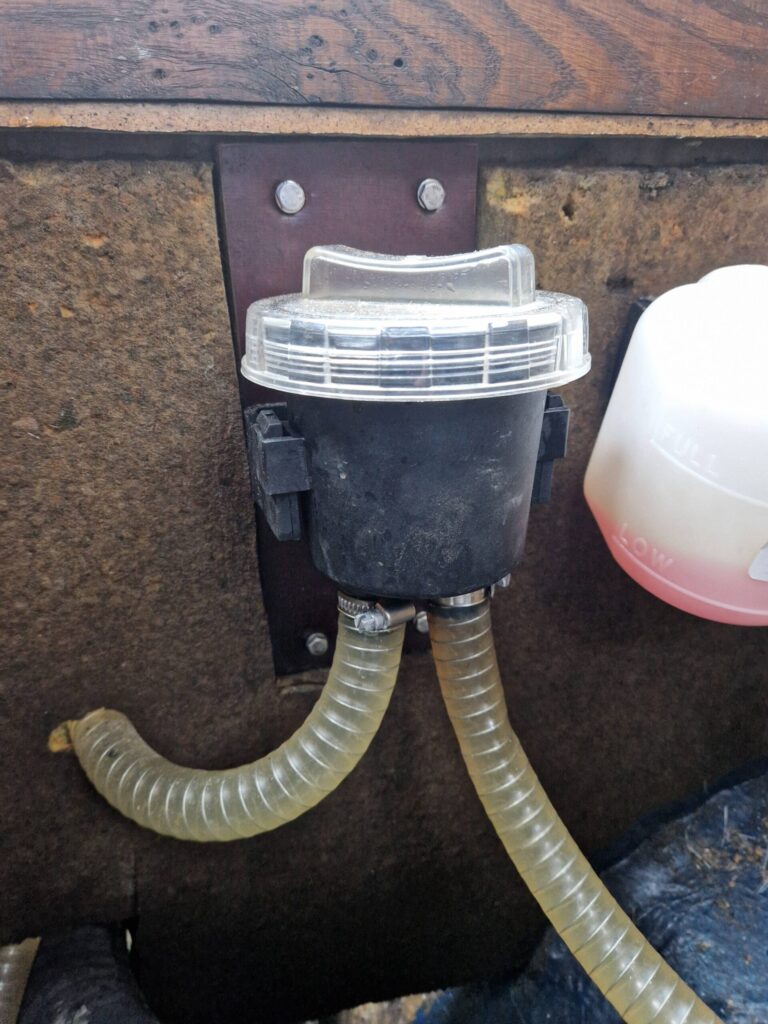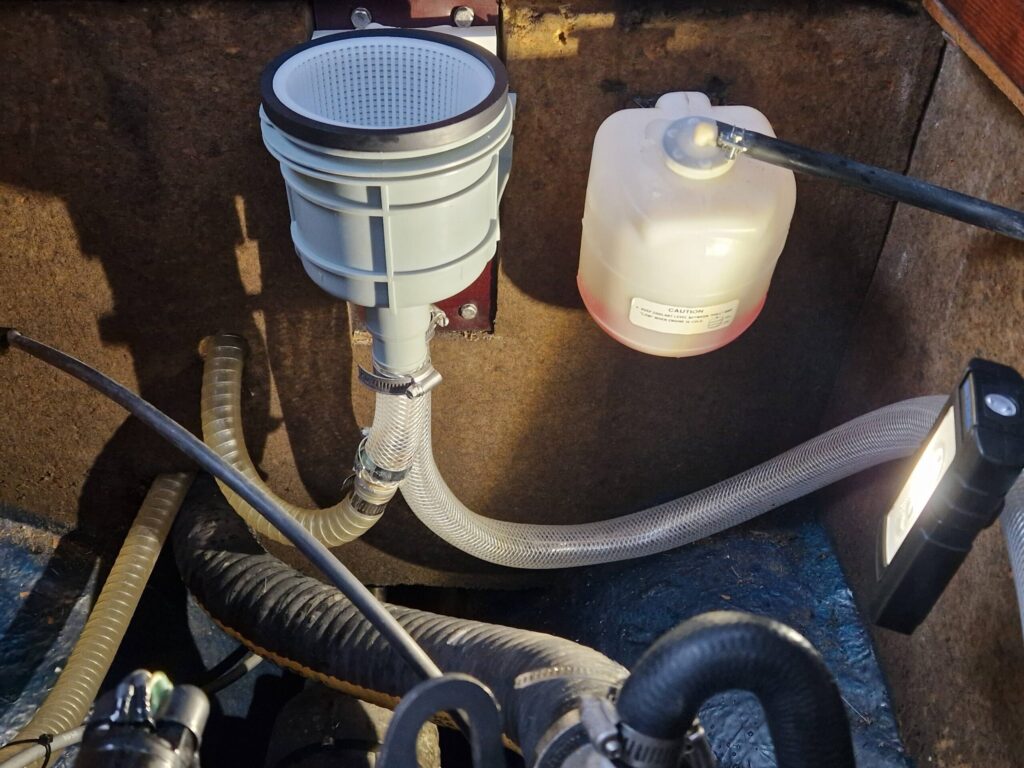 Jeg faldt over et tips på Jens Koch’s www.baadteknik.dk side hvor man har et andet låg til sit søvandsfilter som så kan benyttes til at suge eddike op fra en spand hvis man vil afkalke sit kølesystem på saltvandssiden, eller hvis man vil vinter konservere med frostvæske. I år gør jeg begge dele, så først husholdningseddike, som står natten over, og så dagen efter frostvæske.